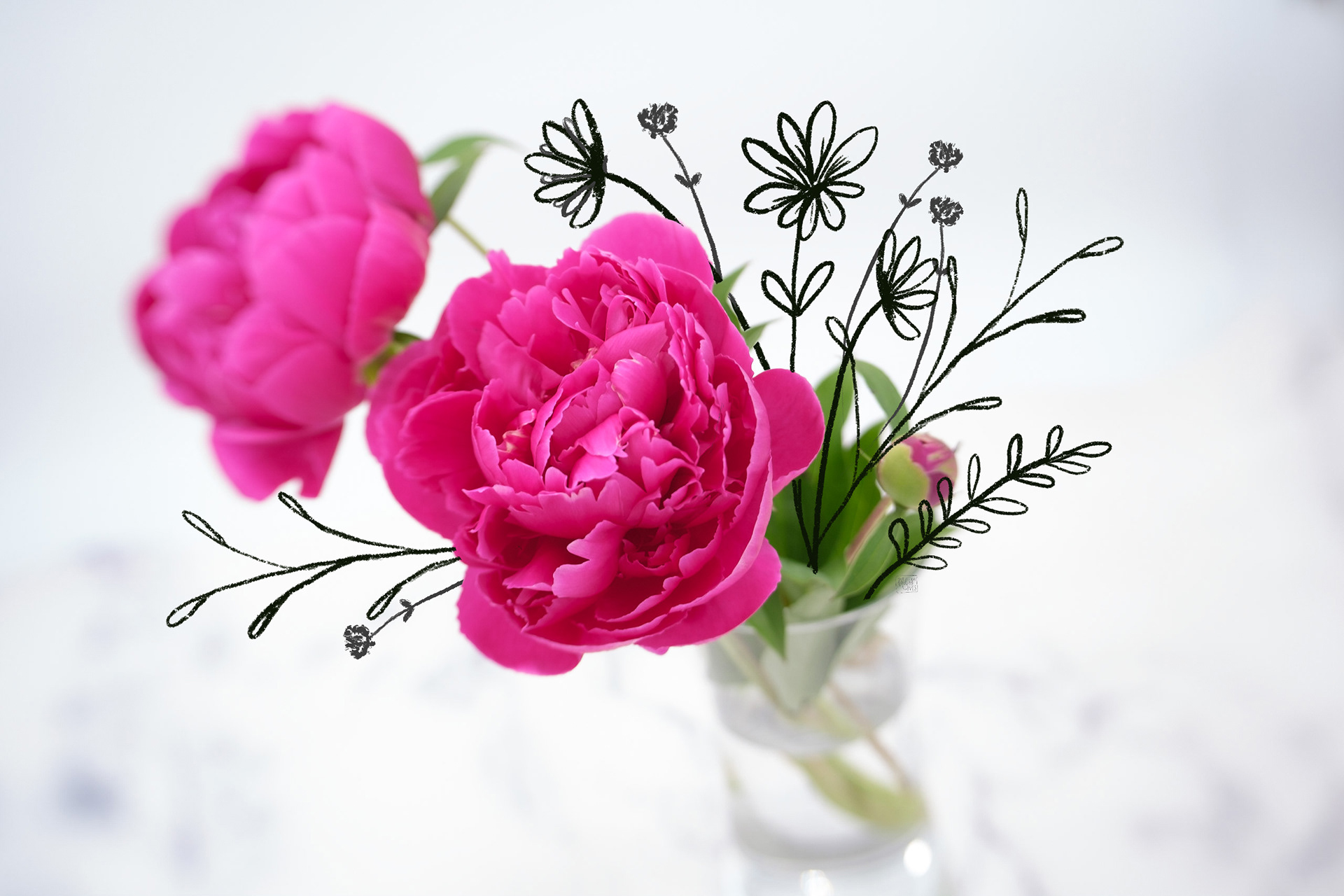 I cut these peonies from the garden and brought them in for a photoshoot. I rounded out the composition with some sketched wildflowers.